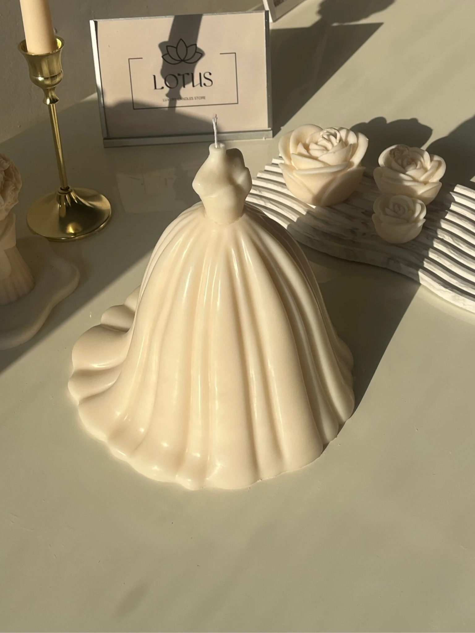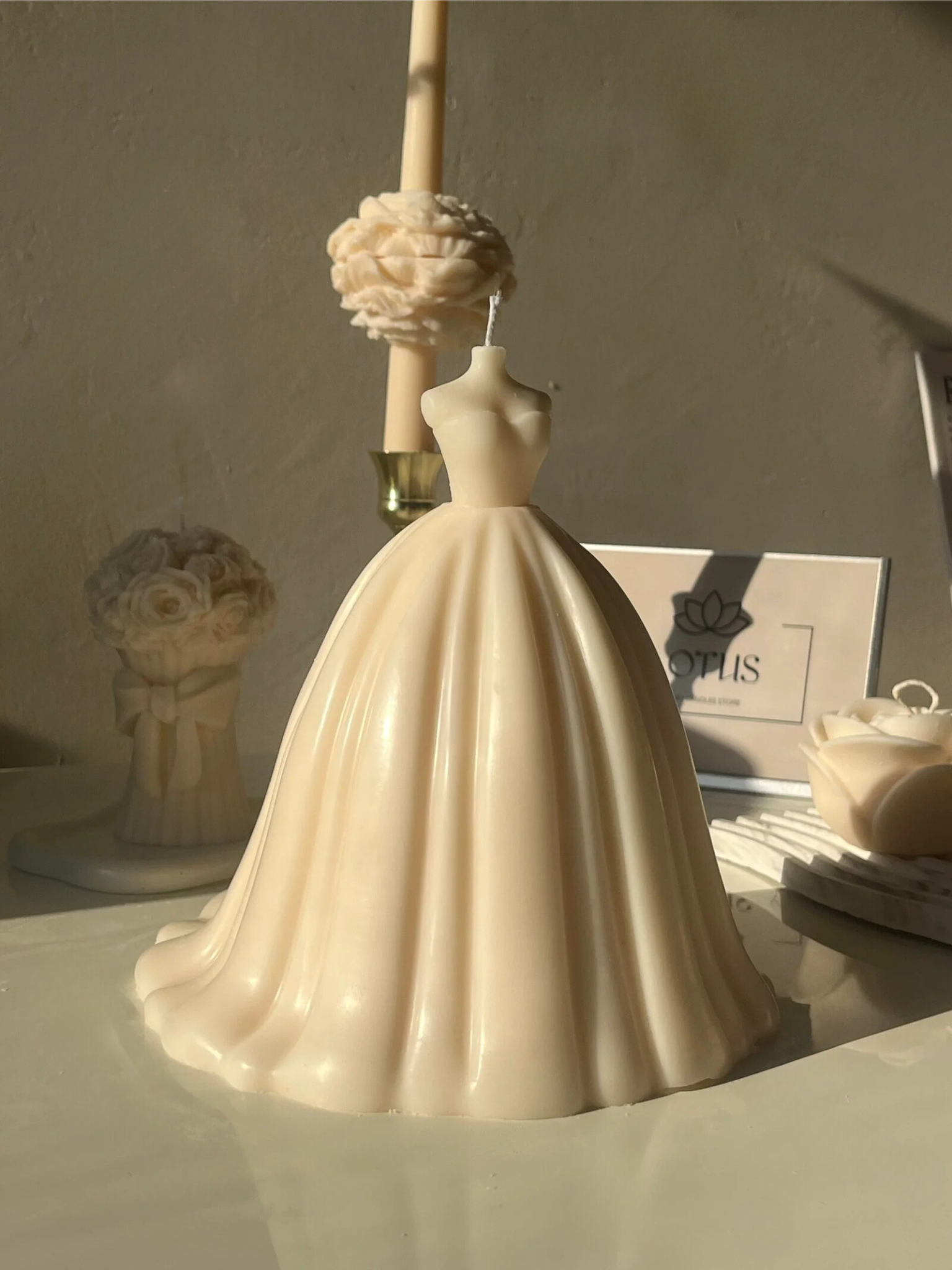 A unique candle designed as a bridal gown, made from 100% natural wax to bring elegance and sophistication to any space. This candle is perfect as a decorative piece or a beautiful gift for weddings and special occasions, capturing the beauty and grace of a bride.