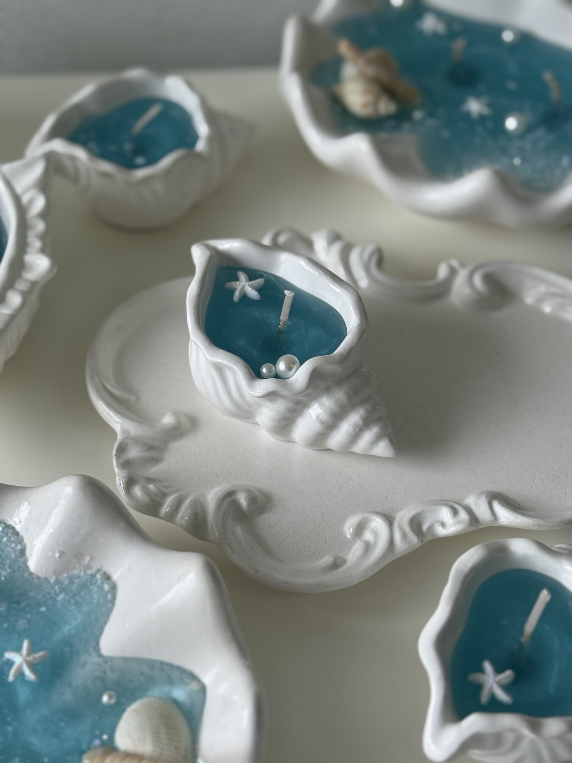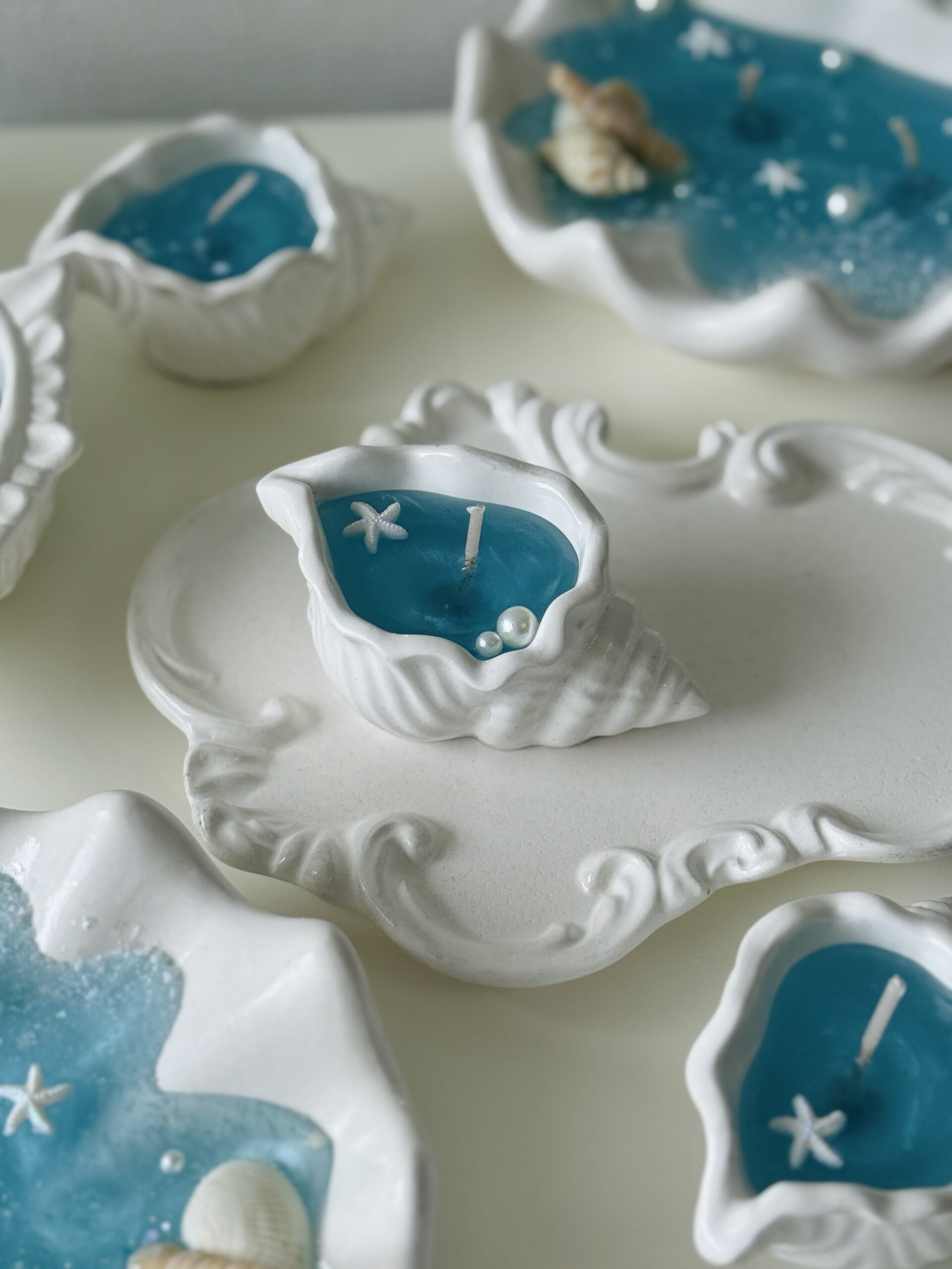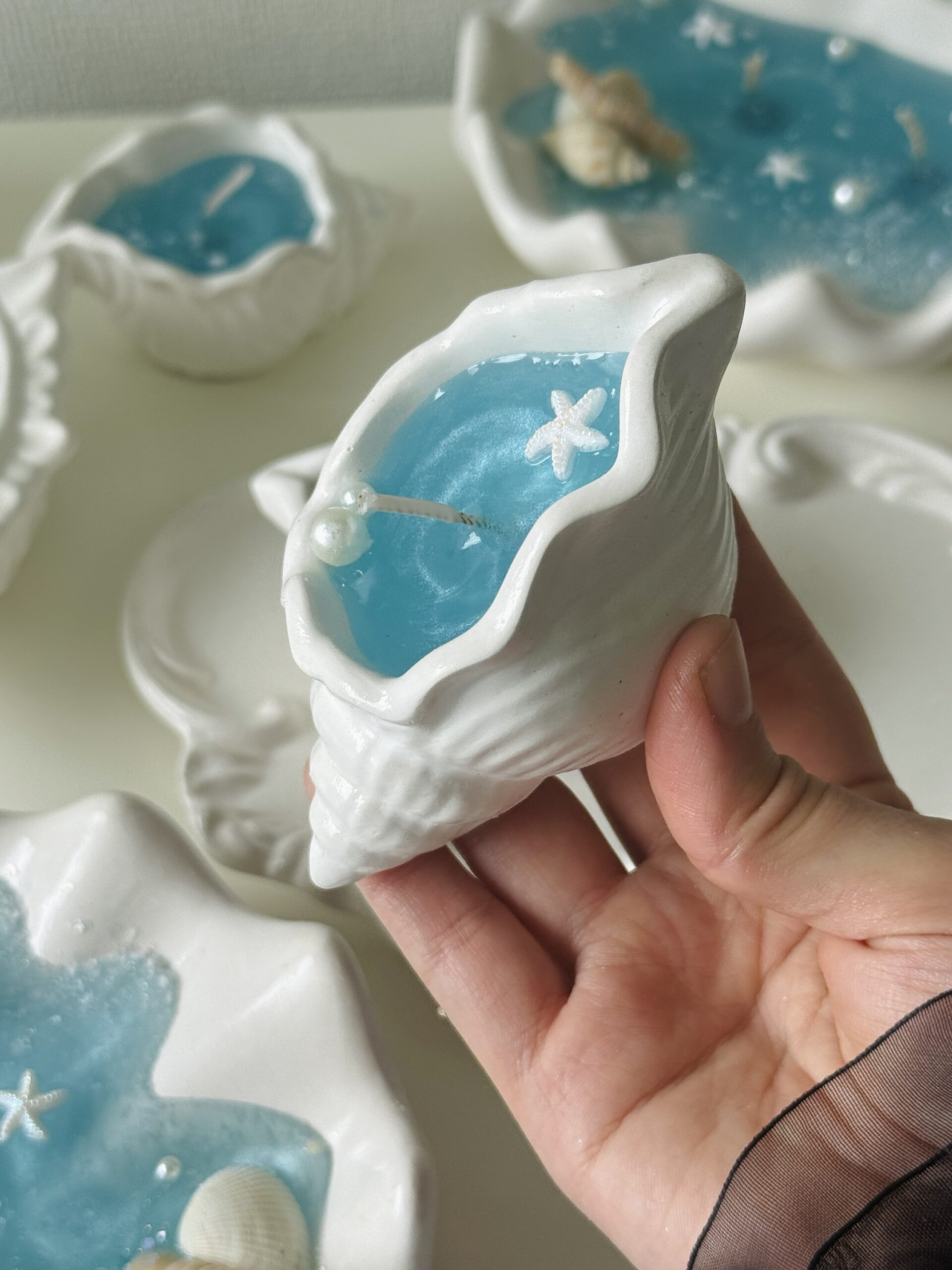 The candle is hand-poured into a white concrete shell-shaped base, filled with ocean-blue gel wax for a calming coastal vibe.