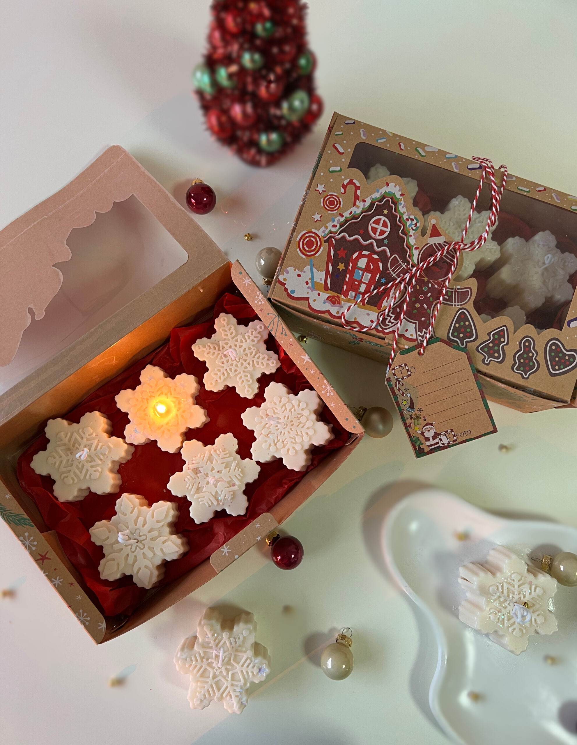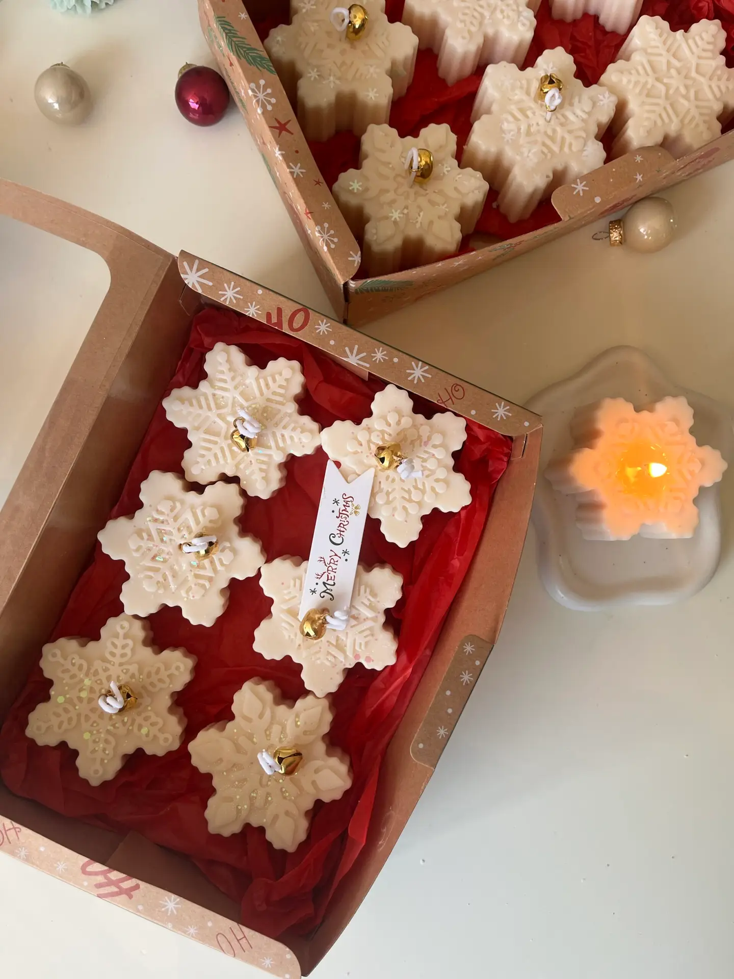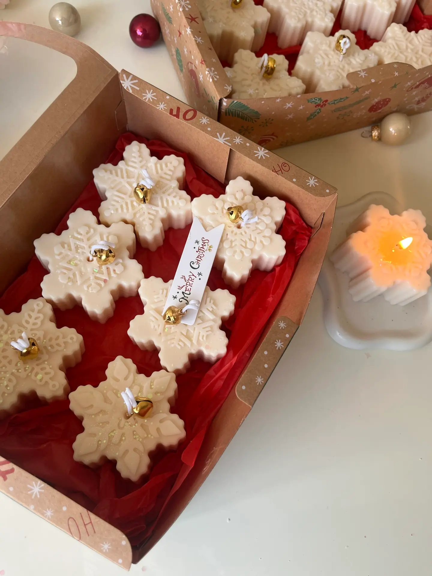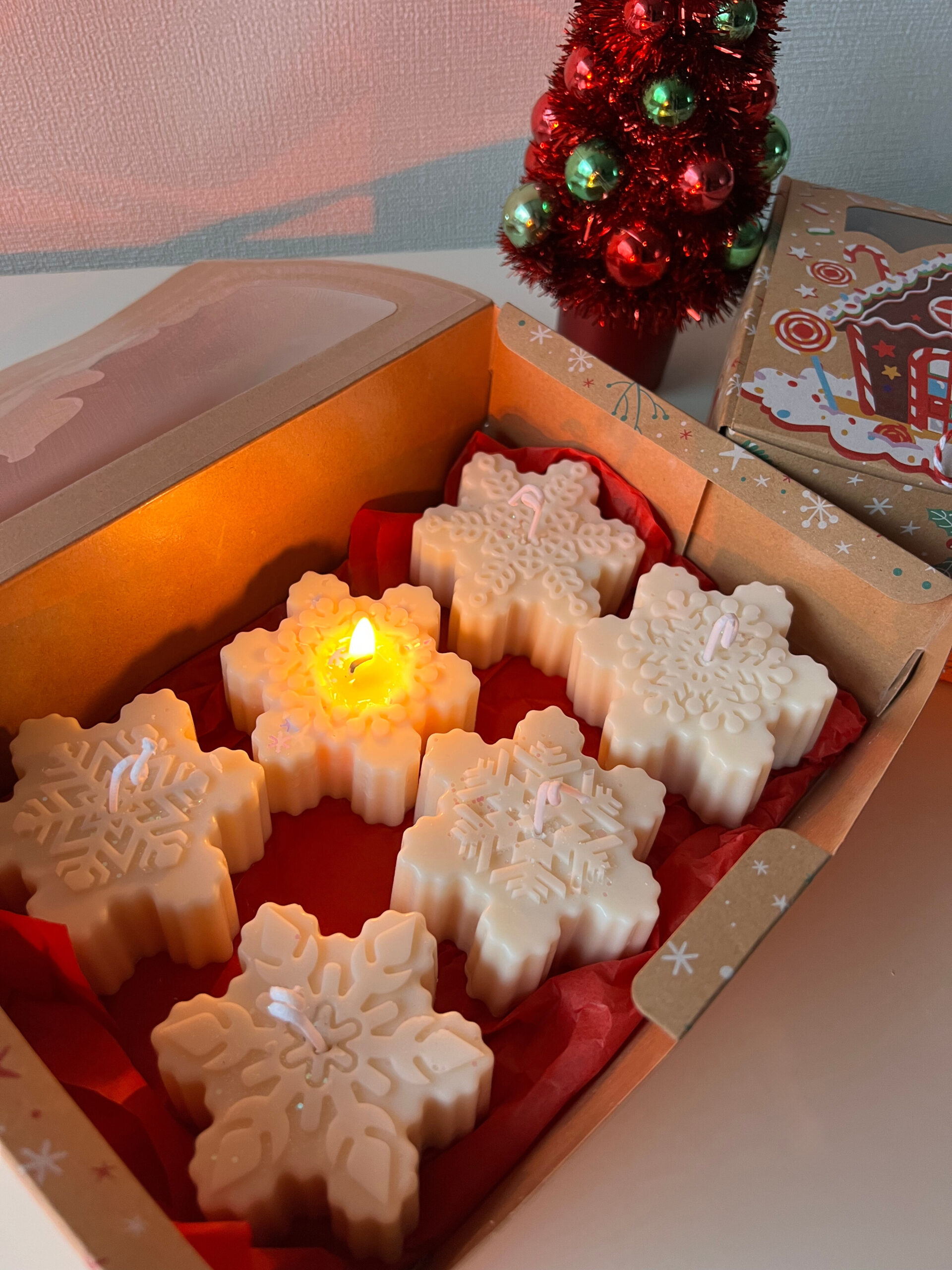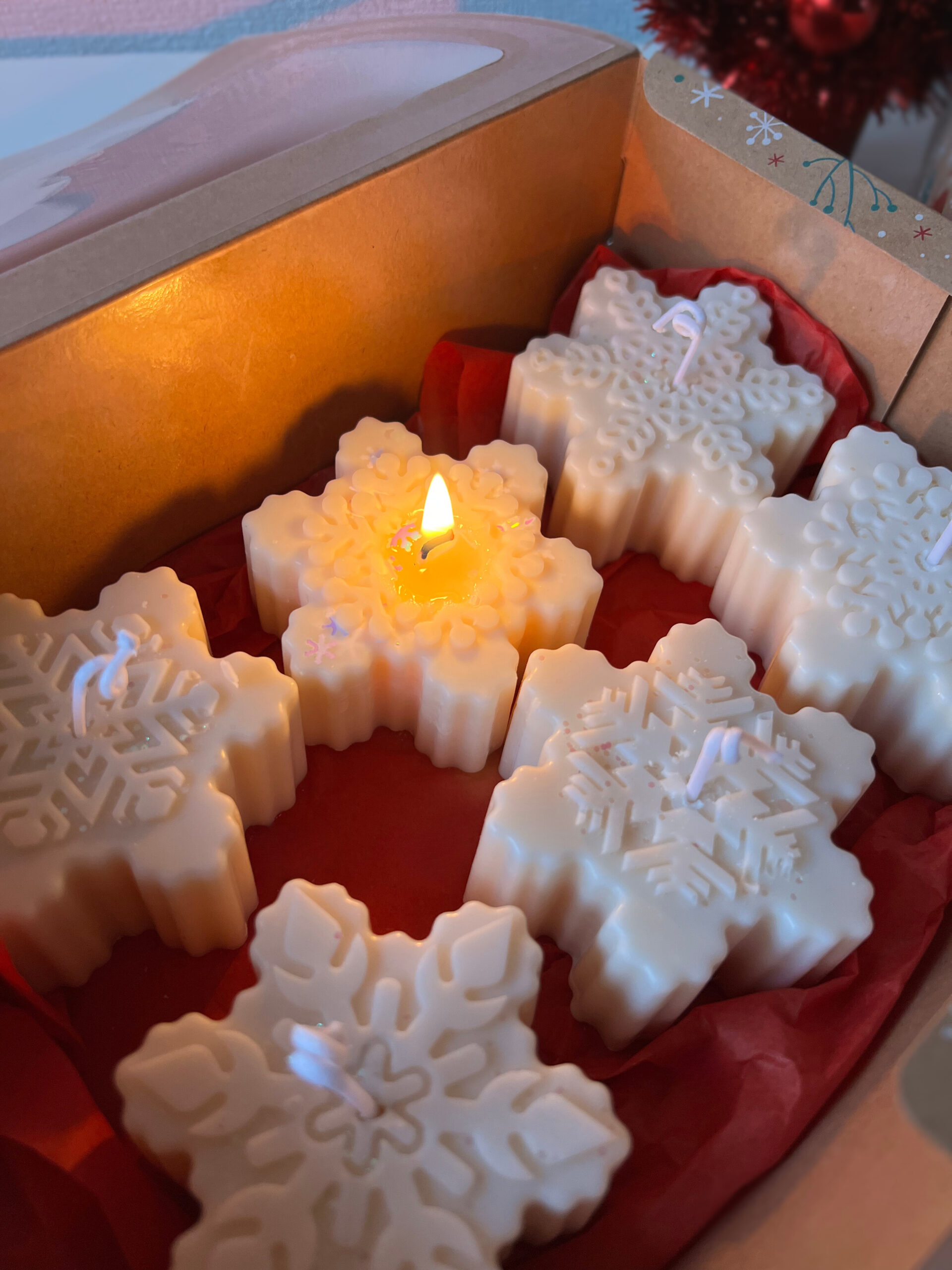 A delightful set of 6 snowflake-shaped candles crafted from 100% natural wax. Each candle features intricate snowflake details, perfect for adding a wintery charm to any setting. Ideal for holiday decor or as a unique seasonal gift to bring warmth and elegance to the cold months.